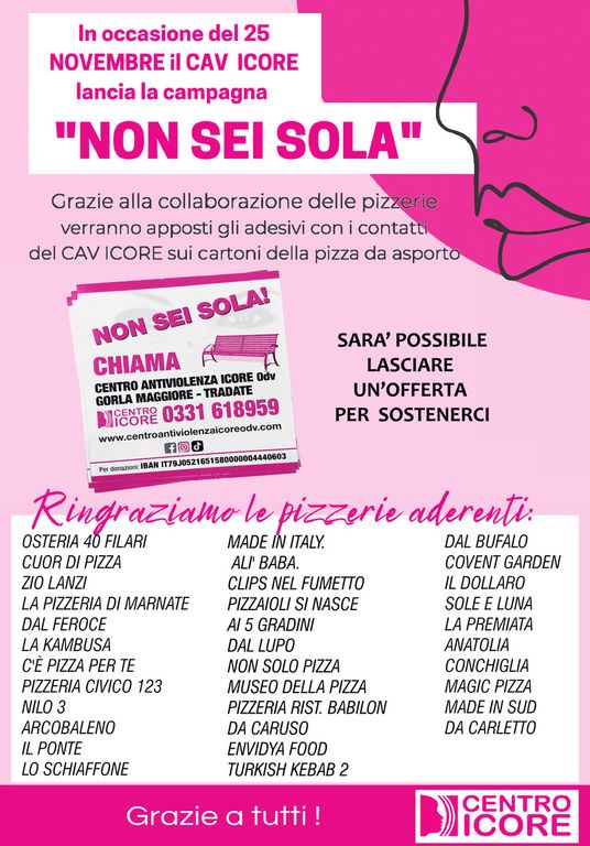 In occasione del 25 novembre, giornata internazionale per l'eliminazione della violenza sulle donne, il centro antiviolenza Icore di Gorla Maggiore ha coinvolto le pizzerie della Valle Olona e quelle dei comuni di Cassano Magnago, Tradate, Venegono Inferiore e Superiore, Castiglione Olona, Lonate Ceppino, Cairate e Castelseprio per un impegno collettivo affinché si attui una maggiore presa di coscienza sul fenomeno della violenza sulle donne.