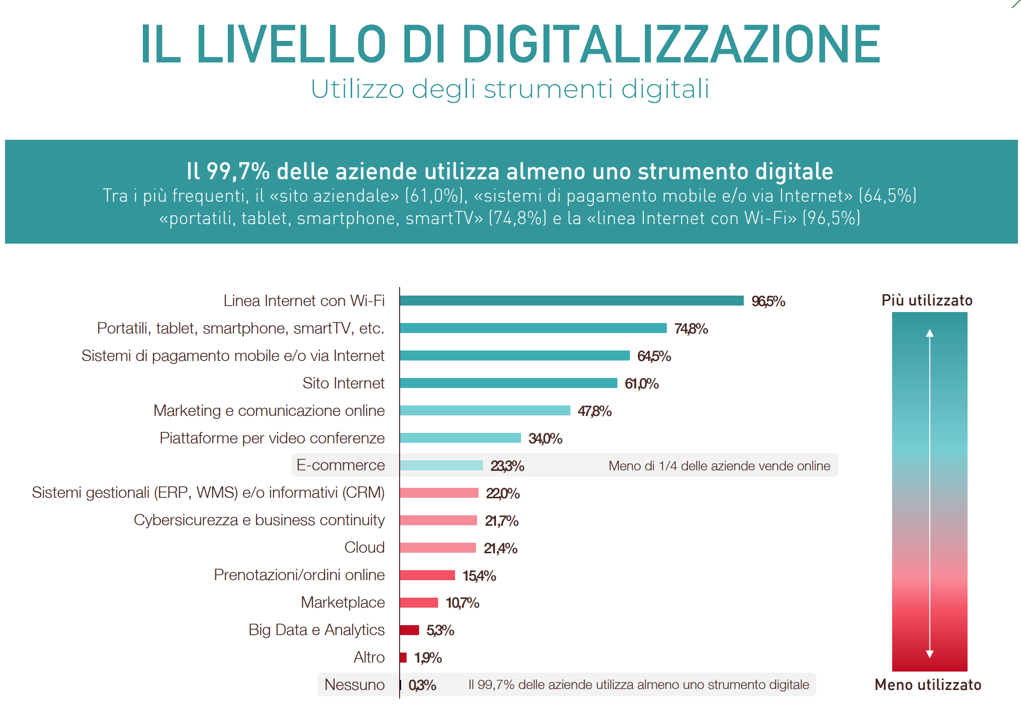 Il 99,7% delle aziende utilizza almeno uno strumento digitale, tra quelli proposti all’interno del questionario somministrato. Più della metà del campione analizzato possiede una “linea Internet con Wi-Fi” (96,5%), dei “portatili, tablet, smartphone o smartTV” (74,8%), dei “sistemi di pagamento mobile e/o via Internet” (64,5%), un “sito Internet aziendale” (61,0%). Niente di più. Perché, nonostante la crescita esponenziale del fenomeno nel corso dell’ultimo decennio, risulta ancora bassa la percentuale di esercizi che hanno introdotto l’“e-commerce” nella propria attività per la vendita diretta di prodotti o servizi online. Nel complesso, si parla dunque di un utilizzo piuttosto “basilare” degli strumenti digitali, rispetto alle nuove opportunità offerte dal mercato.