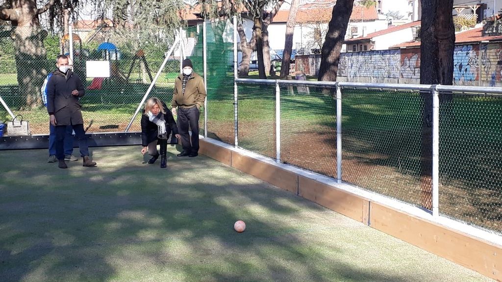 Il sindaco Mirella Cerini testa il nuovo campo da bocce al parco del Buon Gesù