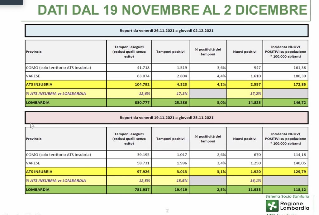 I nuovi positivi si confermano in continuo aumento. In particolare in provincia di Varese nella settimana che va dallo scorso 10 dicembre alla mattinata di oggi sono stati eseguiti 69.188 tamponi che hanno individuato 2.800 nuovi positivi per un'incidenza che sale a 313,71 nuovi casi ogni centomila abitanti. Nella precedente settimana, tra il 3 e il 9 dicembre i tamponi erano stati 55.936 e i positivi accertati 2.073, con un'incidenza di 232,26. Una crescita, dunque, nel Varesotto che si attesta intorno al 30% in sette giorni.