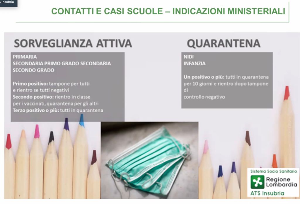 Nello stesso arco temporale sono risultati in quarantena in provincia di Varese 785 alunni per un totale di 64 classi. Sono invece 56 gli operatori scolastici in quarantena. Questa la suddivisione: per nidi e scuole dell'infanzia 344 alunni, 28 classi e 32 operatori; per le primarie 327 alunni, 44 classi e 19 operatori; per le primarie di primo grado 34 alunni, 11 classi e nessun operatore scolastico; per le primarie di secondo grado 80 alunni, 11 classi e 5 operatori.