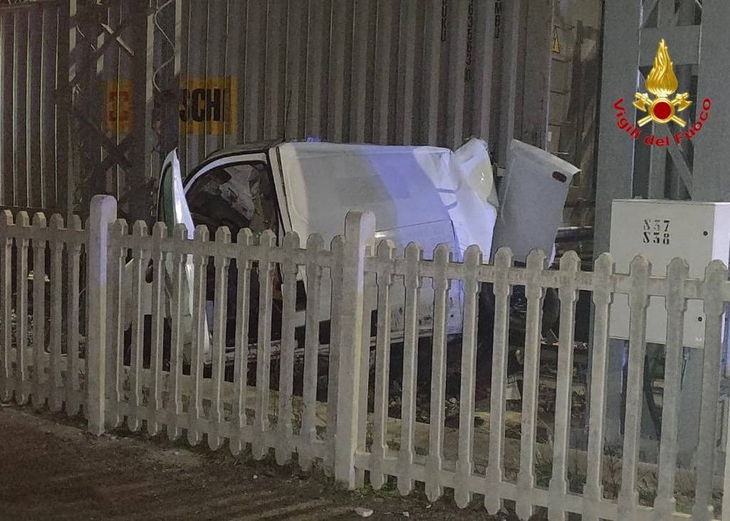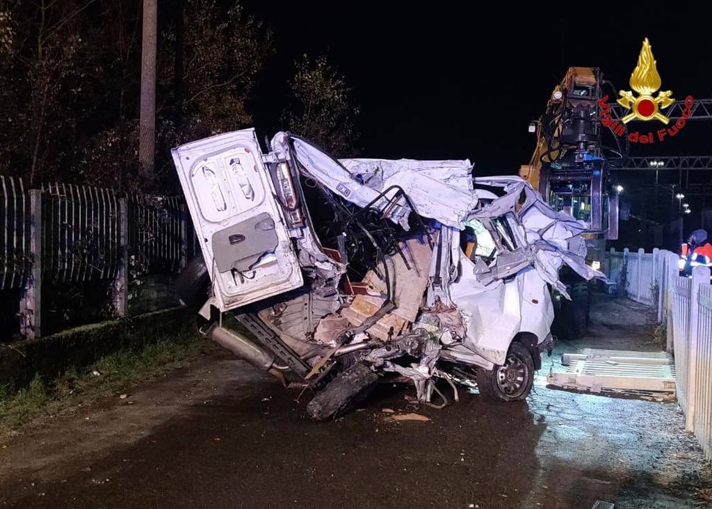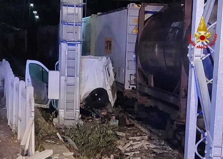 FOTO. Luino, furgone sui binari travolto da un treno merci