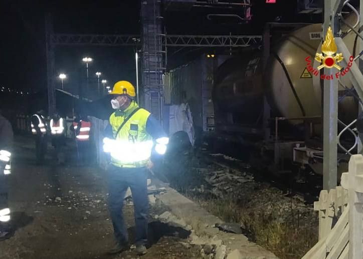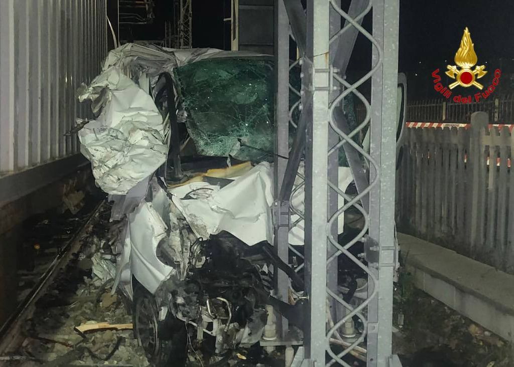 Sono immagini incredibili quelle scattate questa notte dai vigili del fuoco intervenuti per rimuovere il mezzo che bloccava la linea ferroviaria. Il conducente non era presente