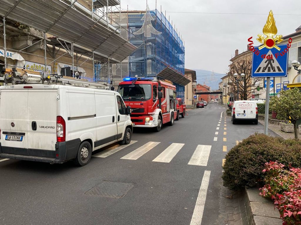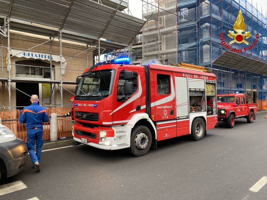 Vigili del fuoco di Luino in azione in piazza XX Settembre per mettere in sicurezza l'area interessata dall'incendio: sul posto stanno operando anche i tecnici dell'azienda elettrica.