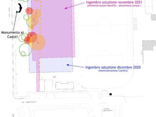 Carlesso, affiancato dall'ingegnere civile e componente della lista, Carla Pusceddu, mostra le differenze («minime») tra il “progetto Catelli” e il “progetto Baroffio”, disegni alla mano. E si domanda: «Il campo piantumato? Davvero non era possibile fare di più?». La risposta nella soluzione, rimasta sulla carta, proposta da “Solidarietà e Progresso” in una riunione allargata dei capigruppo a novembre. «Abbiamo provato ad avanzare una soluzione alternativa, che avrebbe portato ad un impatto molto inferiore sulle alberature e valorizzato il parco, liberando spazio a Nord della struttura per le piantumazioni e preservando il contesto del Monumento ai Caduti (nella prima foto che segue l'articolo, ndr). Sarebbe stata necessaria soltanto una revisione dell'impianto di illuminazione in parte già posato; un problema comunque superabile, ma nonostante le rassicurazioni del sindaco in consiglio comunale si è persa un'altra occasione per dibattere e confrontarsi sui progetti, eventualmente migliorandoli.