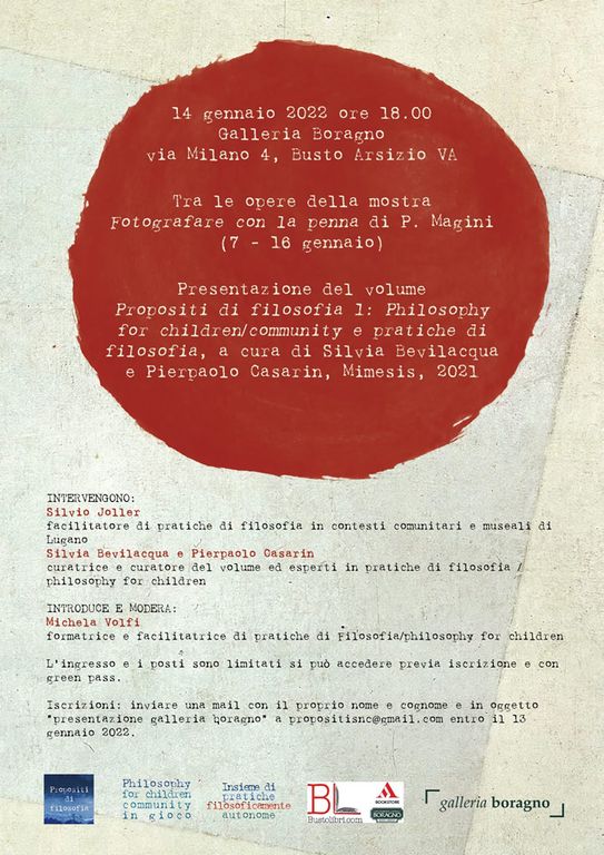 Venerdì 14 gennaio alle 18, infatti, in Galleria si terrà la presentazione del volume "Propositi di filosofia 1: Philosophy for children/community e pratiche di filosofia", a cura di Silvia Bevilacqua e Pierpaolo Casarin, edito da Mimesis.
