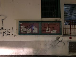 A due passi dal cuore della città sono spuntate svastiche sulle bacheche esterne dell'edificio e il motto vergato in vernice scura che appariva fuori dai lager ("Arbeit macht frei", il lavoro rende liberi).