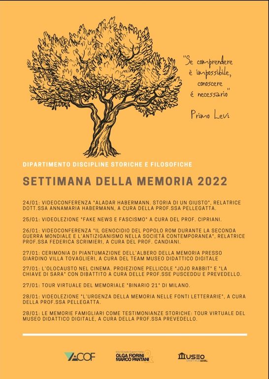 Gli istituti superiori Olga Fiorini e Marco Pantani hanno deciso di celebrare non una sola giornata, bensì un’intera “Settimana della Memoria”, scandita da lezioni e conferenze trasmesse online, in modo da permetterne la massima condivisione in piena sicurezza. Si comincerà lunedì 24 gennaio con Annamaria Habermann che, su invito della professoressa Irene Pellegatta, parlerà della vicenda di suo padre Aladar, medico ungherese che a Busto Arsizio salvò tanti ebrei dagli orrori dell’Olocausto. Il giorno 25 il docente Tomas Cipriani tratterà di “Fake News e Fascismo”, mentre il 26 sarà ospite Federica Scrimieri, professoressa universitaria alla Bicocca di Milano la quale, in un momento curato da Gianluca Candiani, approfondirà la questione del “Genocidio del popolo Rom durante la Seconda Guerra Mondiale”. Giovedì 27, proiezioni di film a scuola (“Jojo Rabbit” e “La chiave di Sara”) con dibattiti curati da Chiara Pusceddu ed Eleonora Prevedello, infine un tour virtuale del “Memoriale Binario 21” di Milano. Ancora due momenti nella giornata del 28 gennaio: Irene Pellegatta parlerà de “L’urgenza della memoria nelle fonti letterarie” mentre Eleonora Prevedello illustrerà le testimonianze famigliari divenute elementi portanti del Museo Didattico Digitale. Su questo portale web, oltre che sui canali social del Liceo sportivo Marco Pantani, sarà possibile trovare i link per seguire buona parte delle videolezioni.