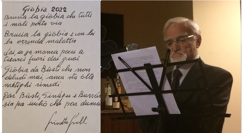 Missione speciale, mettere in fuga il virus. Ginetto Grilli, scrittore e cittadino benemerito di Busto Arsizio (e Sacconago) affida alla Giöbia 2022 questo importante compito. Poco importa se il falò non si potrà eseguire fisicamente in piazza, tutti insieme: le fiamme della speranza saranno più forti.
