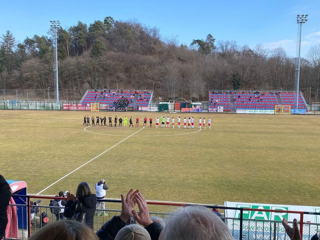 Ci sono almeno un centinaio di tifosi biancorossi in tribuna in questa giornata gelida e nuvolosa, mentre la curva è entrata ora sulla gradinata opposta.
