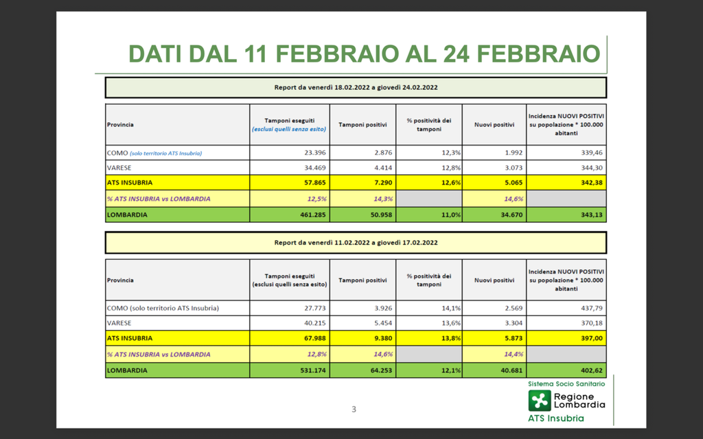 La parola come sempre ai numeri. Nell'ultima settimana i contagi tra la popolazione della provincia di Varese sono stati pochi di meno rispetto a quelli dei giorni precedenti. Dallo scorso 18 febbraio a oggi nel Varesotto sono stati eseguiti 34.469 tamponi che hanno individuato 3.073 nuovi positivi con un'incidenza ogni centomila abitanti di 344,3 casi. Nei sette giorni precedenti, dall'11 al 17 febbraio, i tamponi erano stati 40.215 e i nuovi casi accertati 3.304, con un'incidenza a 370,18. Una riduzione di 231 infezioni.