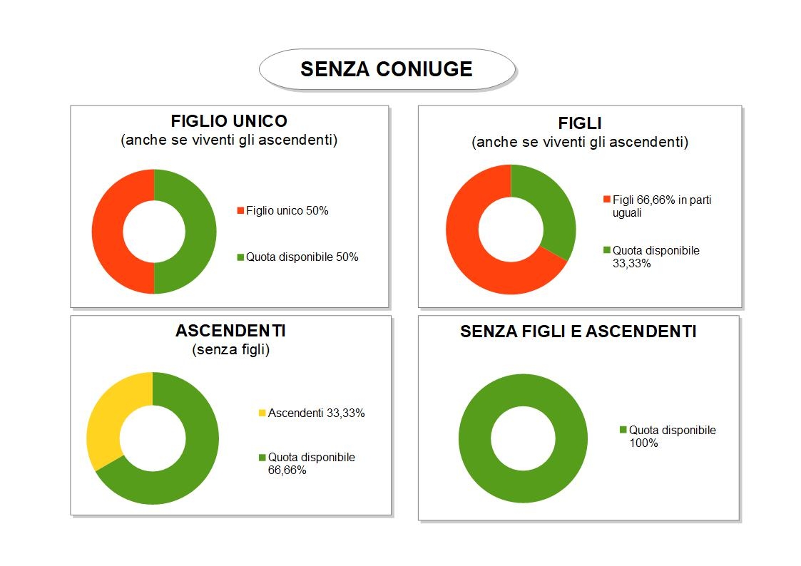 Il testamento, dunque, rappresenta l’unico strumento per poter disporre dei propri beni dopo la morte. E, come sancito dalla legge, è basato su delle regole: la principale è che la libertà di disporre dei propri beni è totale solo in mancanza di familiari prossimi; se invece il testatore ha dei parenti stretti, può decidere solo di una parte del proprio patrimonio mentre il resto, definito quote di legittima, è la parte che va per legge riconosciuta ai suddetti familiari. Nei grafici qui sotto ne vediamo le caratteristiche: il primo spiega cosa accade in presenza di un coniuge vivente; il secondo in assenza del coniuge.