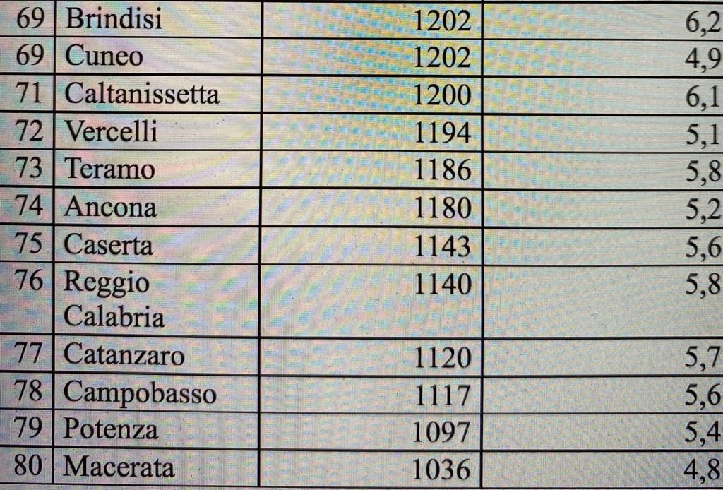 La città più virtuosa d'Italia, però, in termini di spesa aggiuntiva più bassa, è Macerata, dove in media si spendono 1.036 euro in più (+4,8%), seguita da Potenza dove l'inflazione pari a +5,4% determina un esborso addizionale di 1.097 euro, mentre al terzo posto si colloca Campobasso (+5,6%, +1117 euro).