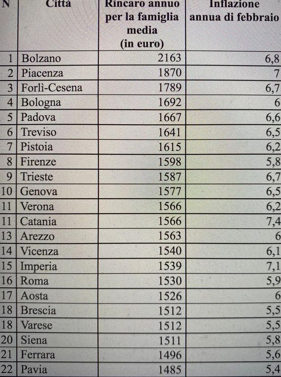 L'inflazione più alta d'Italia è quella di Catania, +7,4%, che però, per via della minor spesa in valore assoluto, si colloca "solo" in undicesima posizione con +1566 euro. Quella più bassa d'Italia, invece, è a Cremona (+4,6%, +1265 euro), seguita a ruota da Como (+4,7%, +1292 euro).