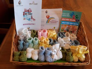 Nel kit, che sarà preparato con attenzione e affetto dalle volontarie Bruna e Fabia, che ha anche disegnato il bigliettino di benvenuto che accompagnerà il pacchetto, conterrà al suo interno delle scarpine realizzate a mano con amore dalle frequentatrici del knit cafè della Corte del Ciliegio, grazie ad una donazione che ha permesso loro di acquistare il filato necessario, e un opuscolo creato grazie alla collaborazione di tutte le realtà che sul territorio si occupano dei piccoli da 0 a 3 anni, che contiene tutte le informazioni utili sui servizi presenti per questa fascia d’età.