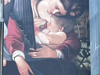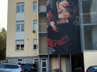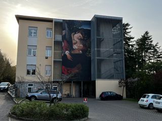 Ancora una volta la scelta è caduta su Caravaggio: la parete principale dell’istituto scolastico immerso nel verde ospita infatti una spettacolare riproduzione di un particolare dell’opera “Riposo durante la fuga in Egitto”, risalente al 1597. Il dettaglio si sofferma su Maria che stringe al petto il piccolo Gesù. Un dettaglio significativo per una scuola a contatto con i più piccoli.