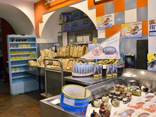 «Abbiamo anche cose particolari, come i gamberi viola della Liguria, gli scampi di San Benedetto e i calamaretti dell’Adriatico, e poi il carpione, fatto con triglie, sogliole e branzini. Una volta il carpione era un modo di conservare il pesce, ed era fatto con specie di non eccelsa qualità come la tinca, la carpa o la scardola. Si aveva fame e tutto andava bene, si usava soltanto l’aceto e il pesce intero, oggi si è più raffinati, si adoperano i filetti e una miscela di sapori. C’è parecchia richiesta anche di scatolame selezionato: ci vantiamo di vendere il tonno Carloforte, le acciughe salate di Girolamo Balistreri di Bagheria, una vera prelibatezza. È un’azienda con cui lavoriamo da 35 anni, ci dà la prima selezione, da 12mila latte da 10 chilogrammi l’una, ne sono uscite 400, selezionate per noi. Teniamo le acciughe a maturare per un anno prima di venderle».