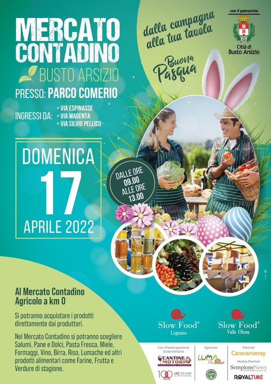 Nonostante sia il giorno di Pasqua, la terza domenica del mese resta un appuntamento fisso per il Mercato Contadino di Busto Arsizio, che appunto il 17 aprile si svolgerà puntualmente al Parco Comerio dalle 9 fino alle 12; si potrà accedere da via Espinasse, via Magenta e via Silvio Pellico.