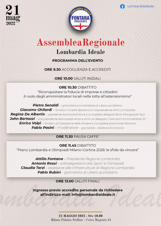 All’assemblea regionale di “Lombardia Ideale - Fontana Presidente”, che si terrà domani, sabato 21 maggio, al Palazzo delle Stelline, in Corso Magenta 61, a Milano, interverrà alle ore 10.30 il senatore Matteo Salvini, segretario della Lega.