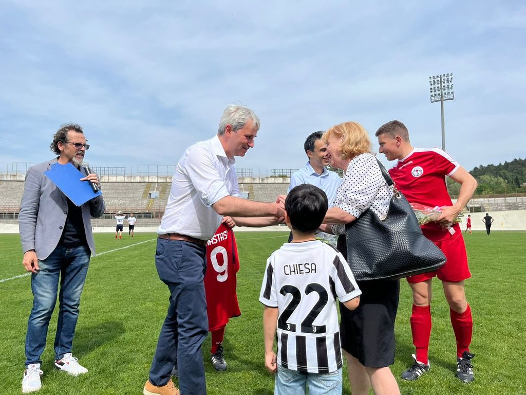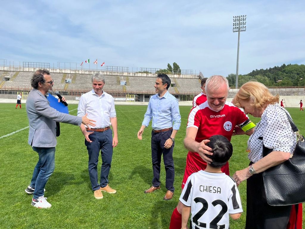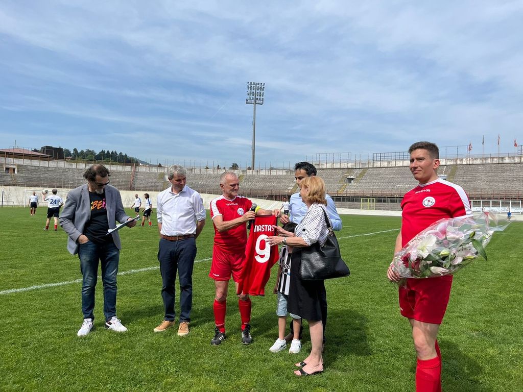 Prima del calcio d'inizio, però, forse uno dei momenti più belli: alla vedova di Pietro Anastasi, Anna Bianchi, è stata consegnata in ricordo del marito la maglia della Nazionale Italiana Magistrati.