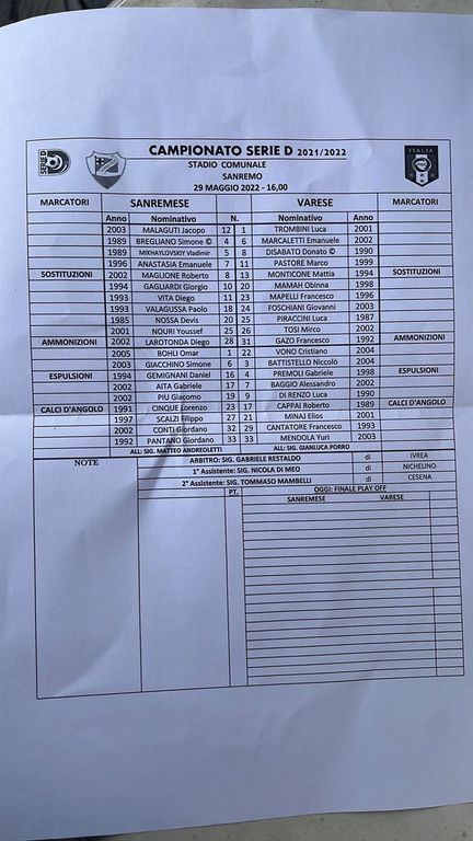 SANREMESE (4-2-3-1) Malaguti; Bregliano, Mikhaylovskiy, Nossa, Nouri (Cinque 42' st); Larotonda, Valagussa (Gemignani 26' pt), Gagliardi; Maglione, Vita (Conti 16' st), Anastasia. A disp.: Bohli, Giacchino, Aita, Più, Scalzi, Pantano. All.: Matteo Andreoletti.