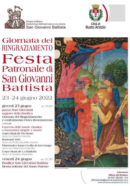 Un evento coordinato dall’Assessorato alla Cultura a cui parteciperanno la Filarmonica Santa Cecilia di Sacconago, diretta da Marco Ferrario e Francesco Carcello, il Corpo Musicale Pro Busto diretto da Franco Conetta, il Corpo Musicale La Baldoria, diretto da Quirino Pisaniello e Borsound 1919, diretto da Pedro Rodolfo Guerra: ogni banda proporrà un paio di brani del suo repertorio, poi tutti i musicisti saliranno sul sagrato per la conclusione del concerto con le bande a formazioni riunite.