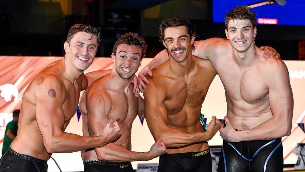 Foto di Giorgio Scala / Andrea Staccioli DBM (@deepbluemedia) tratte dalla pagina Facebook e dal sito ufficiale della Federazione Italiana Nuoto: Nicolò Martinenghi, 23 anni il 1° agosto e primo da sinistra dopo il trionfo con la 4x100 mista, è onnipotente