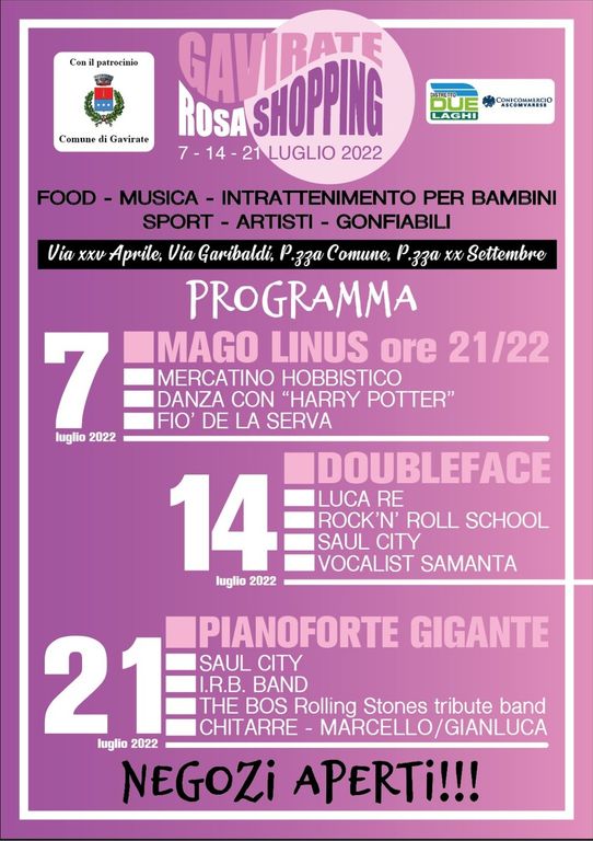 Tre giovedì sera (il 7, il 14 e il 21 luglio) con negozi aperti, mercatini, danze, concerti, cibo e molto altro. Le aree interessate saranno Via XXV Aprile, Via Garibaldi, Piazza Comune e Piazza XX Settembre.