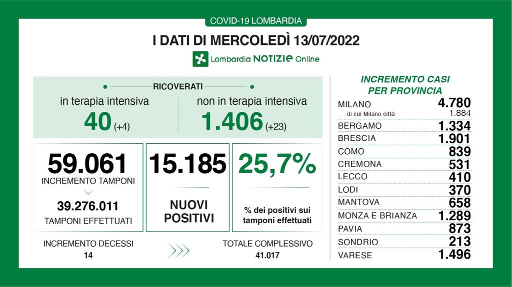 Per quanto riguarda i decessi in Lombardia oggi si registrano 14 vittime. Ieri i decessi erano stati 15. Con l'ultimo aggiornamento è di 41.017 il numero delle persone positive al Covid-19 decedute in Lombardia dall'inizio dell'emergenza.