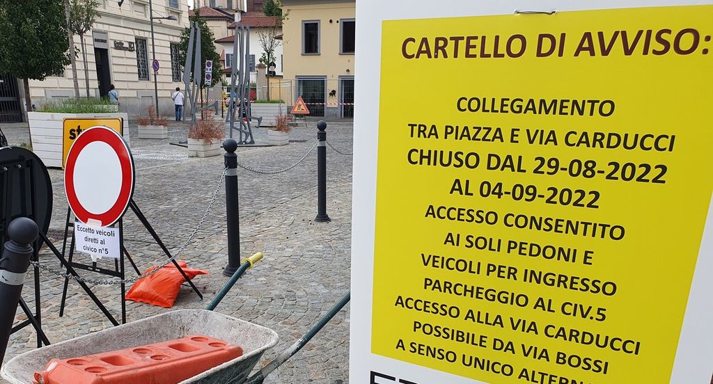 Nonostante i cartelli, alcuni automobilisti in arrivo da via Zappellini/Borroni o da via Pozzi hanno cercato di attraversare la piazza come di consueto, transitando sul pavé, salvo poi accorgersi della viabilità modificata e fare dietrofront.