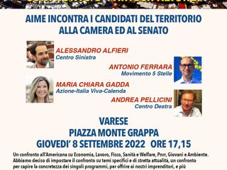 Aime – Associazione Imprenditori Europei – incontra i candidati del territorio alla Camera ed al Senato, in vista delle elezioni politiche. L'appuntamento è per giovedì 8 settembre – ore 17.15 – in piazza Monte Grappa a Varese.