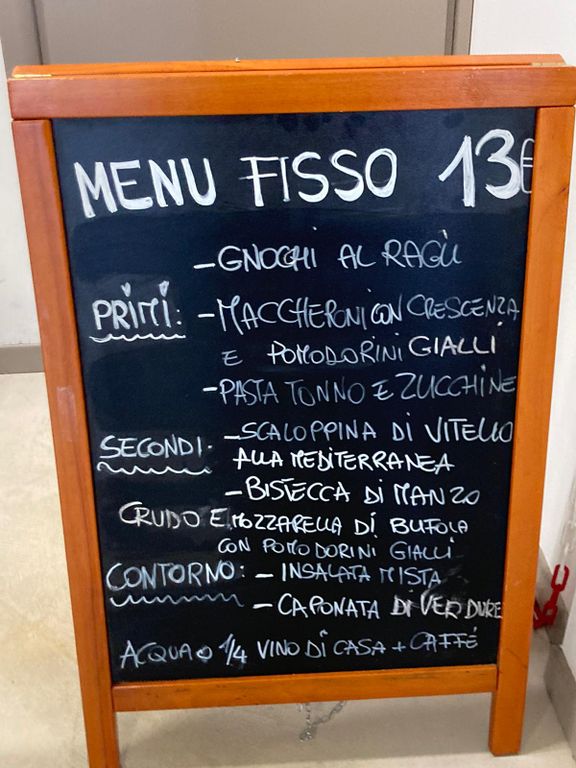 Menù fisso comprensivo di primo, secondo e contorno (oltre ad acqua/vino e caffè) tutto cucinato al momento da Attilio, che offre una cucina mediterranea fatta di pasta e risotti (questi ultimi vera specialità dello chef), ma anche di filetti, controfiletti e, presto, anche pesce. Per concludere, ogni giorno sono disponibili anche due o tre dolci della casa.