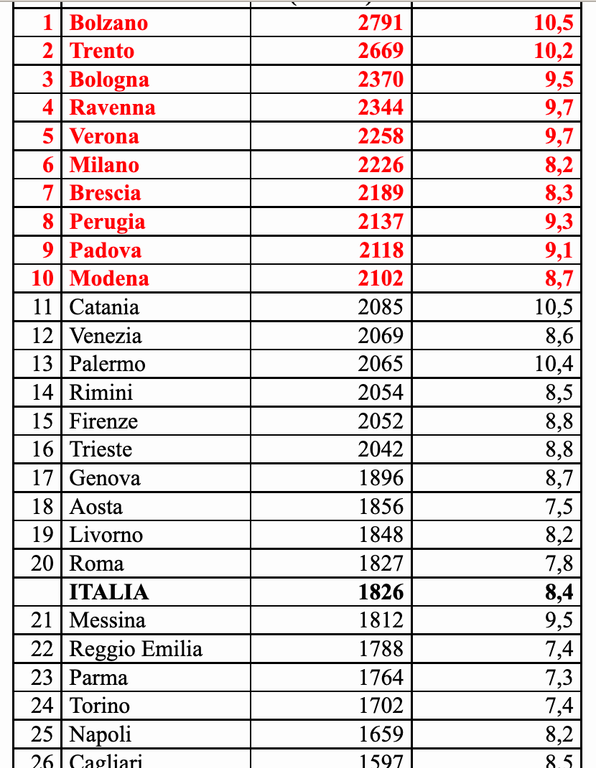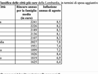 In testa alla classifica dei capoluoghi e delle città con più di 150 mila abitanti più care Bolzano, dove l'inflazione annua, pari a +10,5%, la più alta d'Italia, ex aequo con Catania, si traduce nella maggior spesa aggiuntiva annua equivalente, in media, a 2791 euro. Al secondo posto Trento, dove il rialzo dei prezzi del 10,2%, la terza maggiore inflazione, determina un incremento di spesa pari a 2669 euro per una famiglia media. Sul gradino più basso del podio Bologna, prima per il Centro, dove il +9,5% genera una spesa supplementare pari a 2370 euro annui per una famiglia tipo. Al quarto posto Ravenna (+9,7%, +2344 euro), poi Verona (+9,7%, 2258 euro), Milano che, pur avendo un'inflazione più bassa della media nazionale, si colloca in sesta posizione con +2226 euro, Brescia (+8,3%, 2189 euro), Perugia (+9,3%, +2137 euro) e Padova (+9,1%, +2118 euro). Chiude la top ten Modena, +8,7%, pari a 2102 euro.