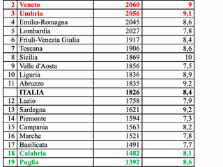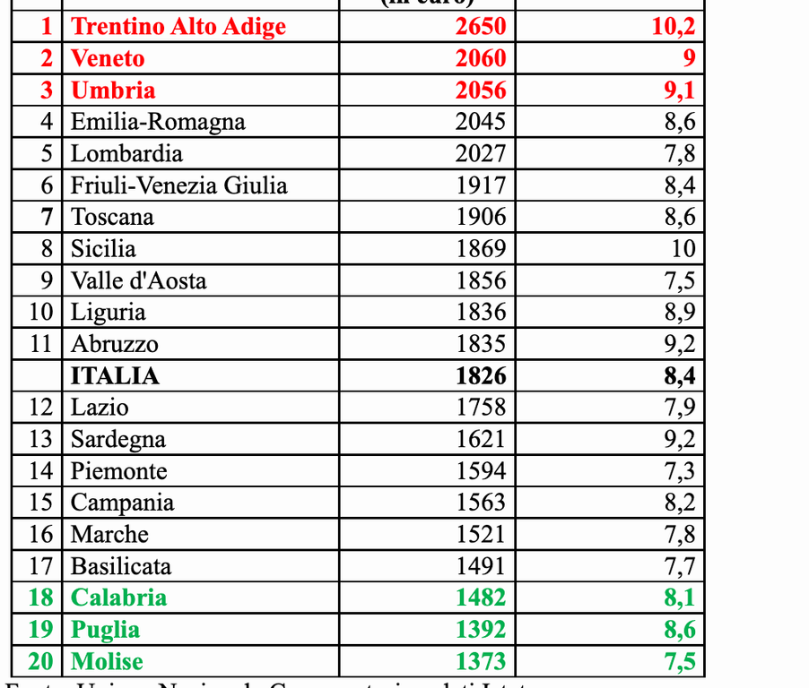La regione più risparmiosa è il Molise, +7,5%, pari a 1373 euro, seguita dalla Puglia (+8,6%, +1392 euro). Medaglia di Bronzo per la Calabria (+8,1%, +1482 euro).