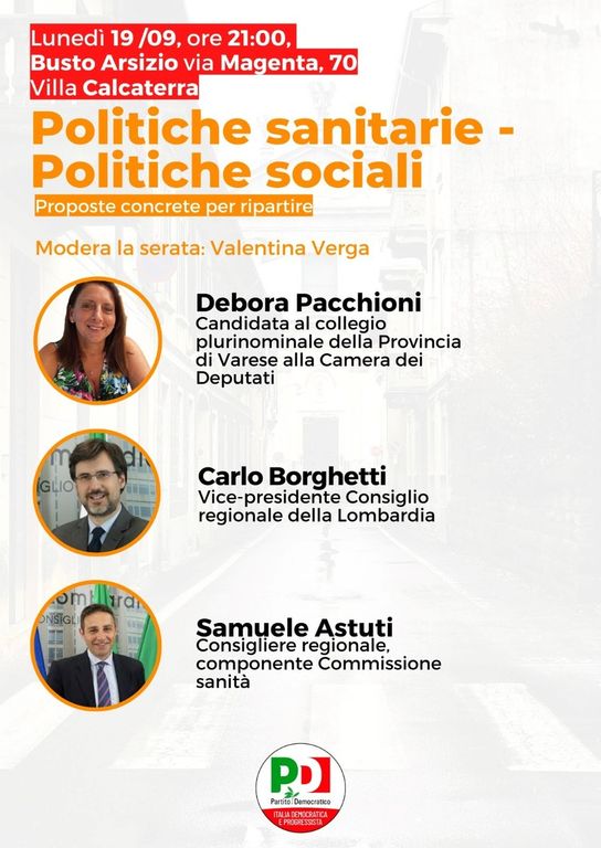 Lunedì 19 settembre, alle ore 21, a villa Calcaterra, in via Magenta 70 a Busto Arsizio, si terrà un incontro sulle politiche sociali e sanitarie.