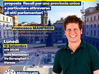 Questa sera, lunedì 19 settembre, alle ore 20.30, presso la Sala Montanari in via dei Bersaglieri 1, si svolgerà l'incontro “Varese è speciale: proposte fiscali per una provincia unica e particolare attraverso gli atti parlamentari”.