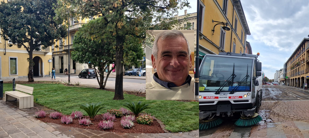 Così piazza Garibaldi può sfoggiare la sua fioritura, in questo inizio d'autunno. In via Cavallotti, le auto hanno ripreso rapidamente il loro posto dopo la pulizia della strada a opera di Agesp.
