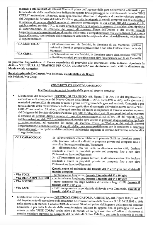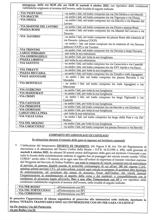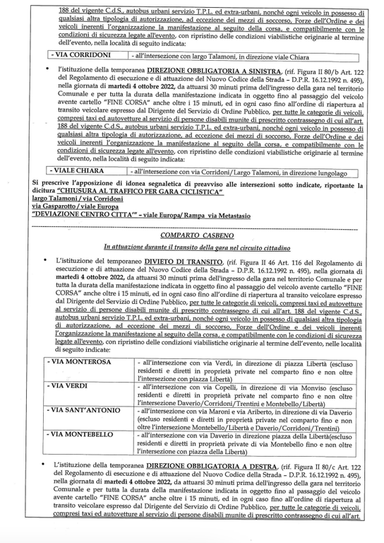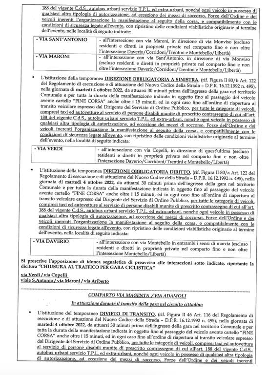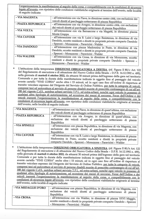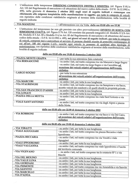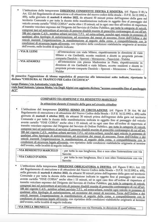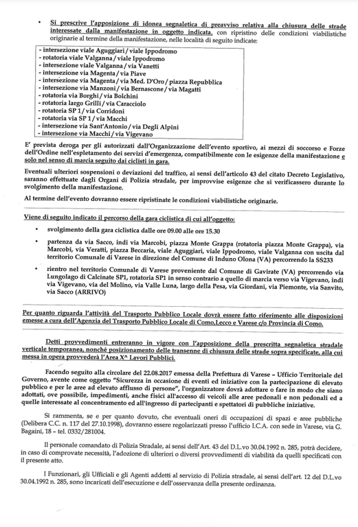 Via Sacco resterà chiusa dalle 00 alle 15.30. Diverse vie del centro, compresa piazza Monte Grappa, resteranno chiuse dalle 3 alle 15.30, altre dalle 8.30 alle 15.30, altre ancora dalle 11.30 alle 15.30, altre - infine - solo in corrispondenza dei passaggi dei ciclisti. Vedi foto per tutti i dettagli.