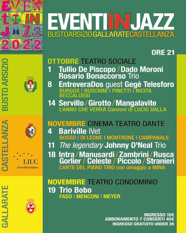 Organizzata dall’imprenditore discografico Mario Caccia, titolare dell’etichetta Abeat Records, e realizzata con il sostegno dei Comuni di Busto Arsizio, Castellanza e Gallarate, la nuova stagione della rassegna, in programma da sabato 1 ottobre a sabato 19 novembre, vede la partecipazione di musicisti del calibro di Tullio De Piscopo, Dado Moroni, Rosario Bonaccorso, Fabrizio Bosso, Peppe Servillo, Javier Girotto, Natalio Mangalavite, Johnny O’Neal e il Trio Bobo, solo per citarne alcuni.