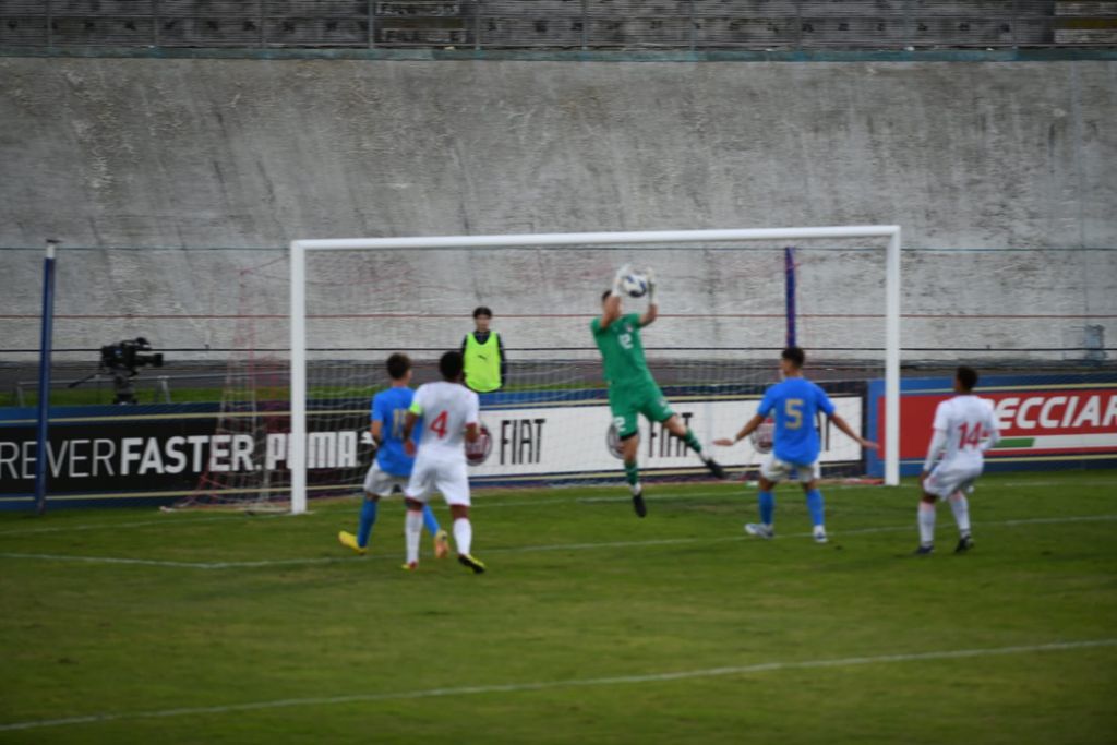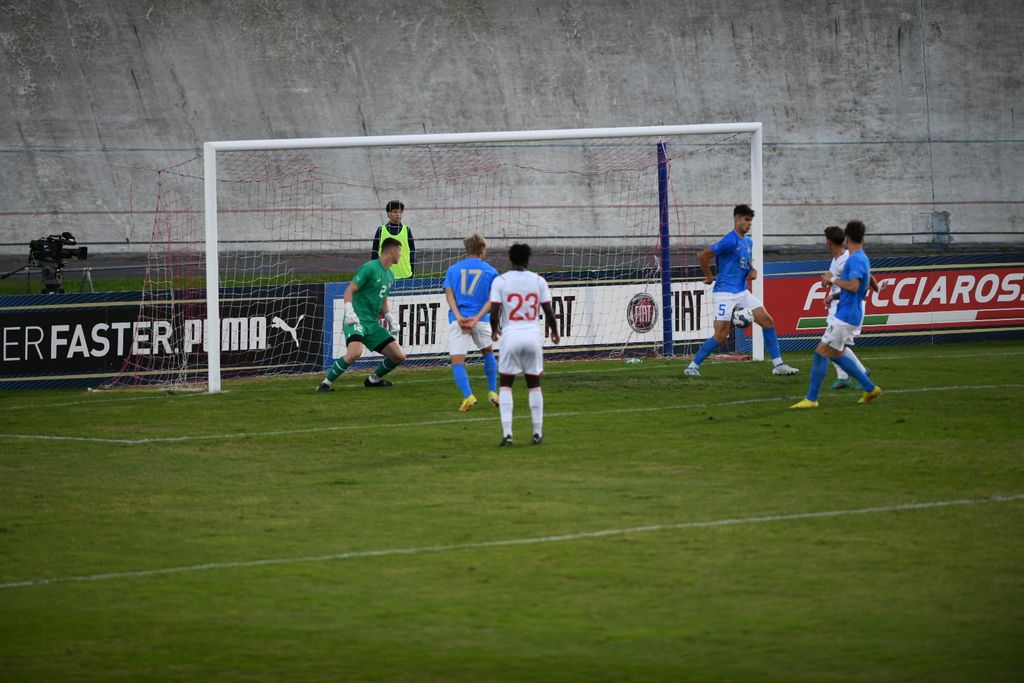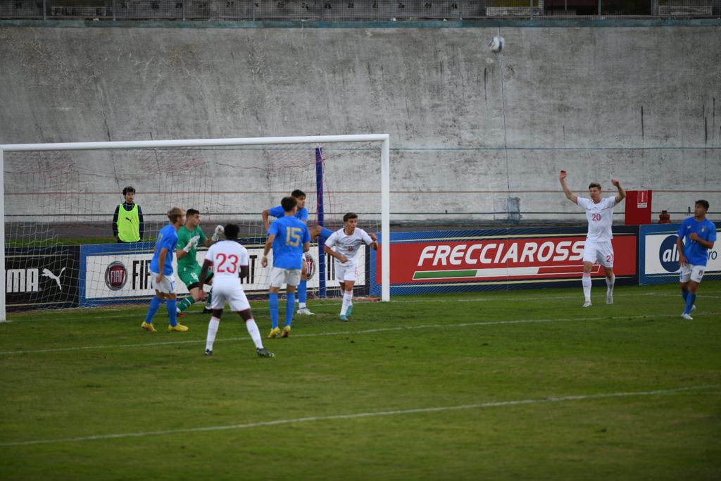 Aperto e divertente il primo tempo. L'Italia di mister Nunziata palleggia bene e spinge sulle fasce, ma sono gli elvetici a essere più pericolosi e concreti, tanto che è il portiere Sassi, del Giugliano, a mettersi in mostra con tre parate. Il gol capita su uno dei tanti capovolgimenti di fronte ed è di casa: al 36' ottimo scambio al limite dell'area tra Terracciano (Hellas Verona) e Montevago (Sampdoria), con questo ultimo che infila un potente destro sotto la traversa sul primo palo.
