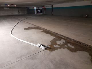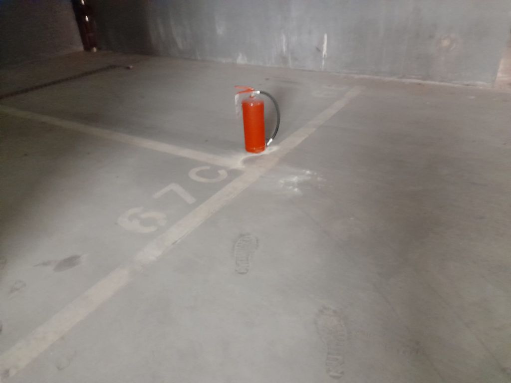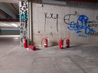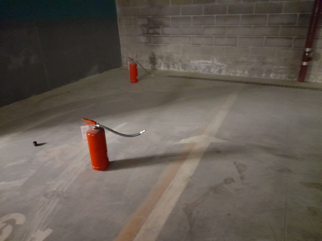Ti avventuri fin là oggi, 27 settembre, e trovi il primo “estintore birillo” in fondo alla svolta che obbliga ad andare a sinistra. A seguire: altri estintori sparsi fra i posti auto e svuotati. Così, almeno, parrebbe a giudicare dalla polvere in cui si può lasciare traccia, come Armstrong sulla luna. Sempiterna? No, ma il dubbio viene gettando un’occhiata al parcheggio. Alcuni estintori, in effetti, sono accumulati all’imbocco della rampa che porta a risalire e uscire dalla struttura da settimane. Anche loro rimossi a caso dalle sedi. Prima di arrivare al “punto di raccolta”, devi osservare e dribblare, ma non sempre è possibile, i “serpenti” attaccati agli agganci per l’acqua.