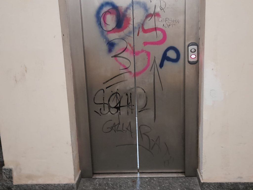 Vinci lo sconforto, imbocchi la porta attraverso la quale si raggiungono ascensore e scale. A terra, fazzoletti di carta e mozziconi che stanno lì almeno dall’inizio di settembre. L’ascensore non funziona. È al piano, lo capisci guardando nella fessura tra le due ante. Ma non va: luce rossa del pulsante accesa, fissa. Fermo per settimane, riattivato, di nuovo inservibile. Non è facile osservare, per via dell’odore, che pare inequivocabile.