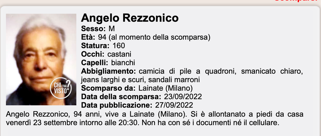 L'appello dei familiari è risuonato attraverso Penelope Lombardia e Chi l'ha Visto. Nonno Angelo ha 94 anni, è alto 1,60, ha occhi castani e capelli bianchi. Indossava camicia di pile a quadroni, smanicato chiaro, jeans larghi e scuri, sandali marroni.