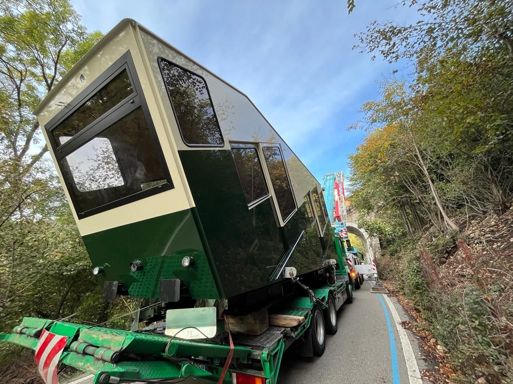 Torna a casa la funicolare di Varese. È stata posata questa mattina la prima delle due cabine totalmente rimesse a nuovo dello storico impianto che collega la città al Sacro Monte.