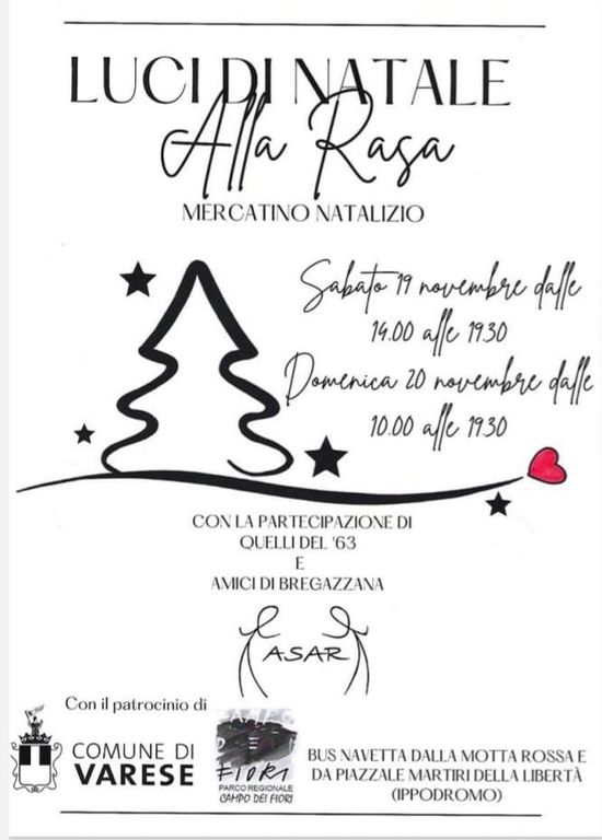 L’appuntamento con le Luci di Natale alla Rasa è per sabato 19 novembre dalle 14 alle 19.30 e per domenica 20 novembre dalle 10 alle 19.30.