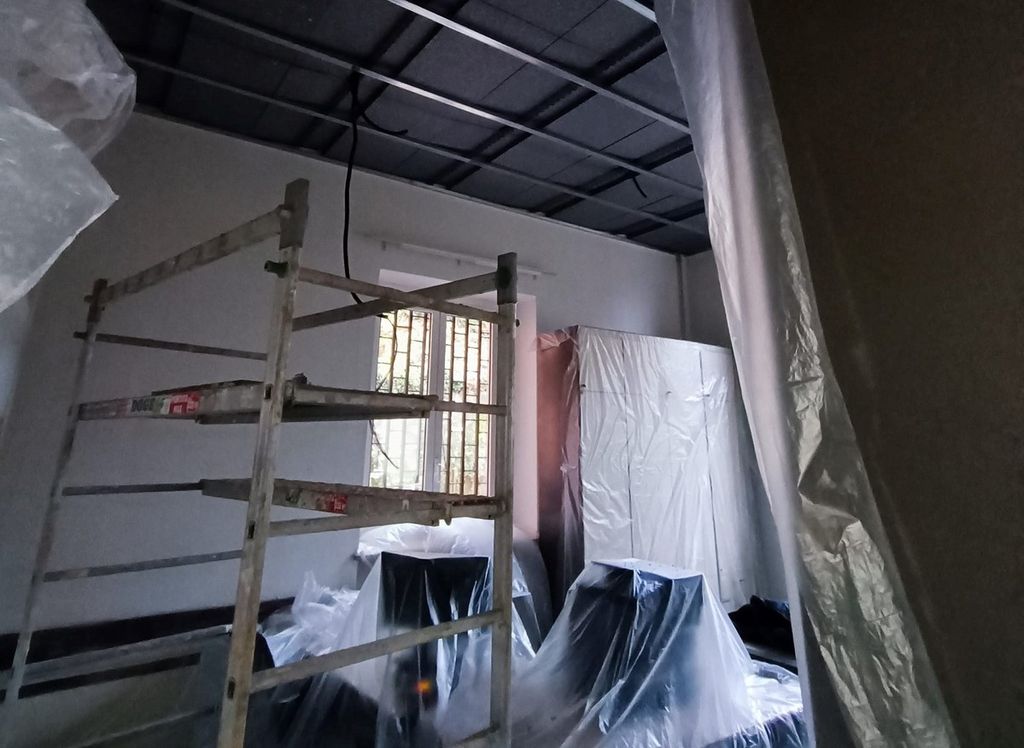 Lavori di efficientamento energetico in corso nel palazzo comunale di Luvinate: scrivanie e mobili coperti dai teli per permettere agli operai d'intervenire sulle coperture e sui soffitti e di montare i ponteggi.