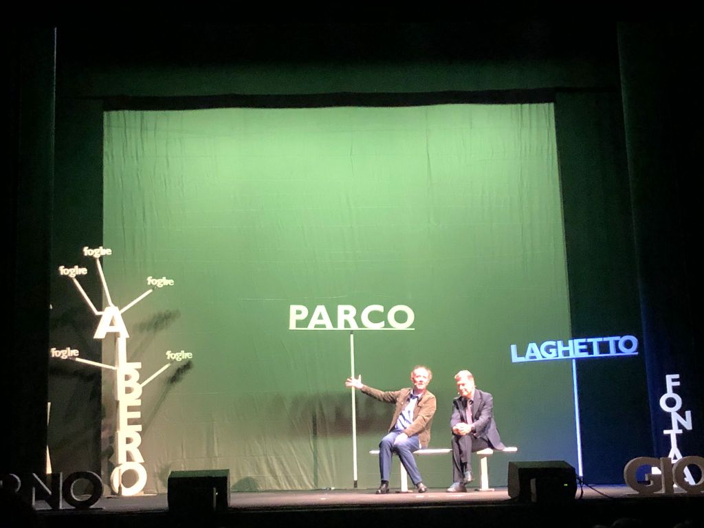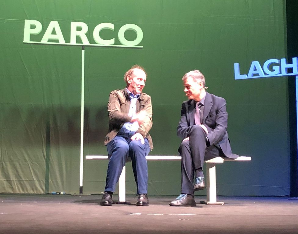 È bastata una panchina accanto alle scritte che stavano al posto di “alberi” oppure “parco, laghetto, giorno, notte, finestra, quadro o divano” per mettere in scena uno spettacolo straordinario che ha decretato il full del teatro Manzoni, ha scatenato risa e applausi di un pubblico entusiasta.