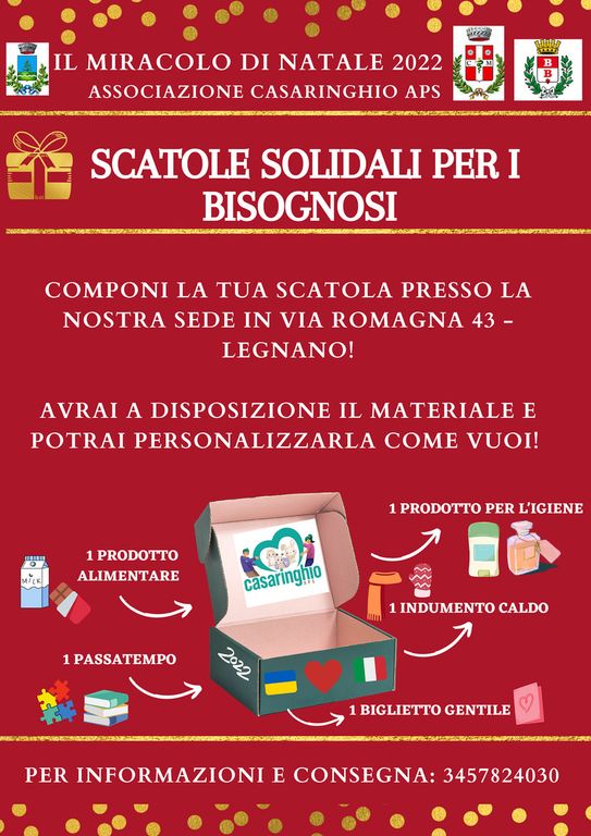 Vista la persistente situazione di estrema incertezza internazionale che ha causato aumenti dei prezzi dell’energia e dei generei alimentari, anche per l’anno 2022 all’avvicinarsi delle festività natalizie, l’Associazione Casaringhio Aps ha deciso di riproporre l’iniziativa delle “Scatole Solidali per i Bisognosi” per portare ristoro fisico e morale alle Persone svantaggiate presenti nella provincia di Varese e nell’Alto Milanese.