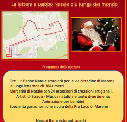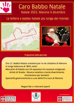 Uniremo e stamperemo tutte le letterine dei bambini Italiani srotolando per le vie di Marene (CN) la letterina più lunga del mondo in un grande evento che si terrà il 4 dicembre 2022. Superiamo insieme la lunghezza di 3841mt pari all’altezza del Monviso!