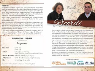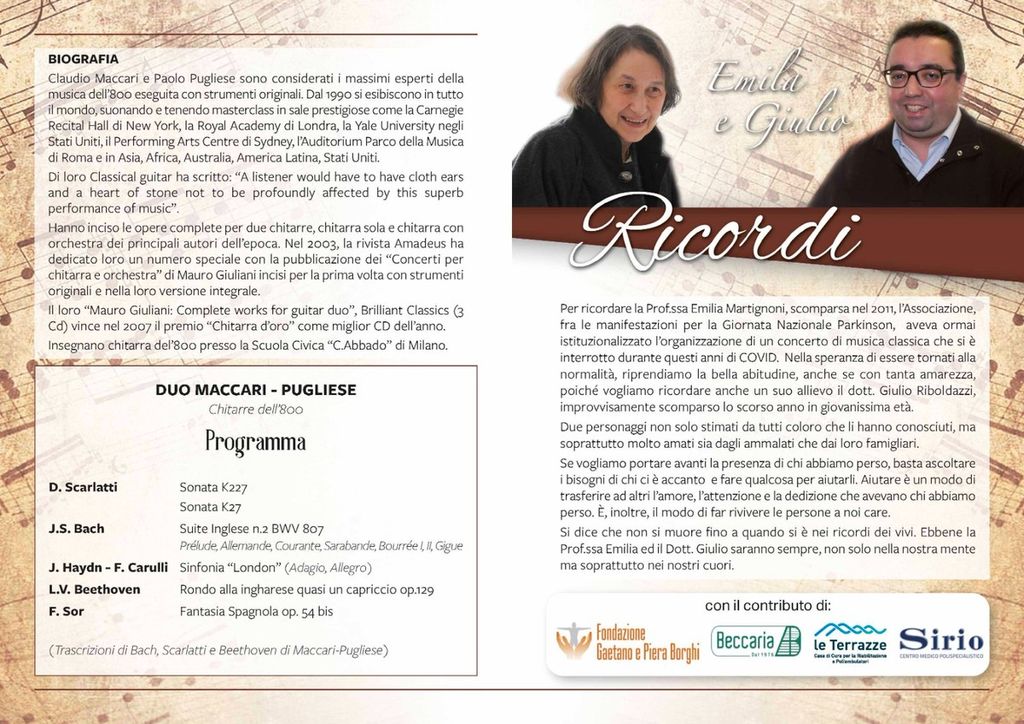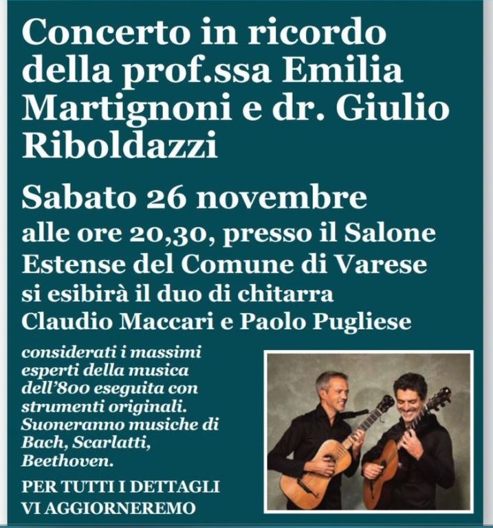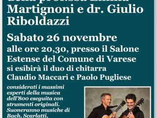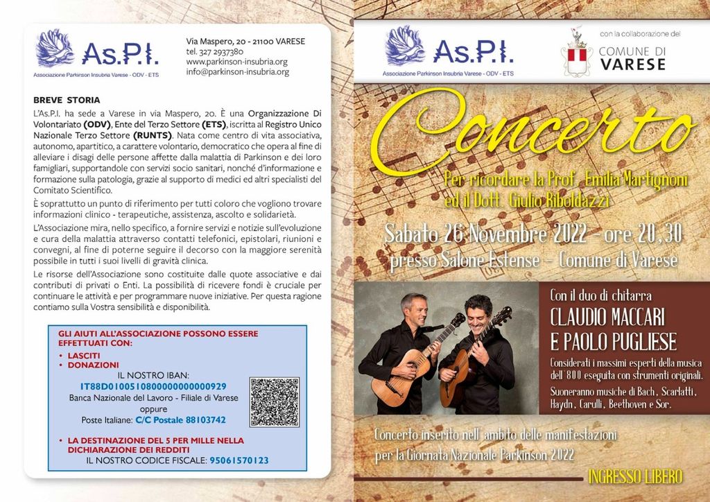 In serata, alle ore 20.30, la giornata nazionale Parkinson a Varese terminerà con un concerto musicale al Salone Estense, entrata libera: il duo varesino composto da Claudio Maccari e Paolo Pugliese eseguirà, con chitarre classiche dell’800, celebri brani di Bach, Beethoven, Scarlatti, Haydn, Carulli e Sor. Il concerto è dedicato al ricordo di due neurologi prematuramente scomparsi: la prof. Emilia Martignoni di Varese e il dott. Giulio Riboldazzi di Busto Arsizio, due medici parkinsonologi molto amati all'ombra del Sacro Monte.